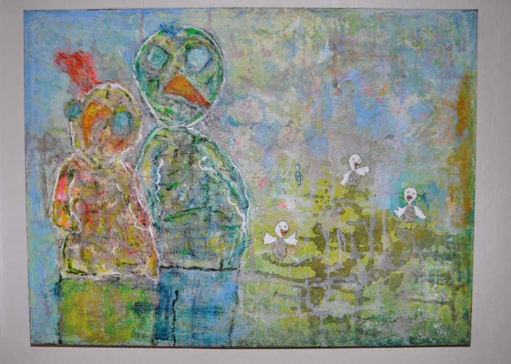 Smilende glad maleri, som er malet på en kraftig dansk kvalitets blindramme, 4 cm dyb og kanten er malet med rundt. Akryl/blandform på lærred. Maleriet er påført klar lak.