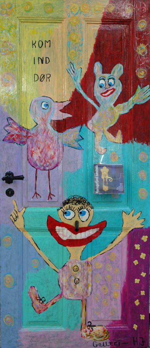 Nedenunder kan I se min dør, som jeg har lavet i anledning af Marigerfjord kunstrute. Den er udstillet på Butikstorvet i Hadsund. På den er der foldere, så I kan se alle de 57 kunstnere, som er med.